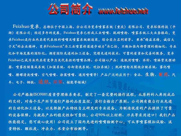 Feizhuo斐卓,以致力于为喷雾技术传递进步动力为己任!坚持自主研发创新,采用行业高端设备和仪器,不断提升产品的性能,让斐卓制造的产品能够完全达到行业高标准的要求,实现国际化的市场供应!喷嘴产品及喷嘴的应用咨询热线:139 1663 9930!
