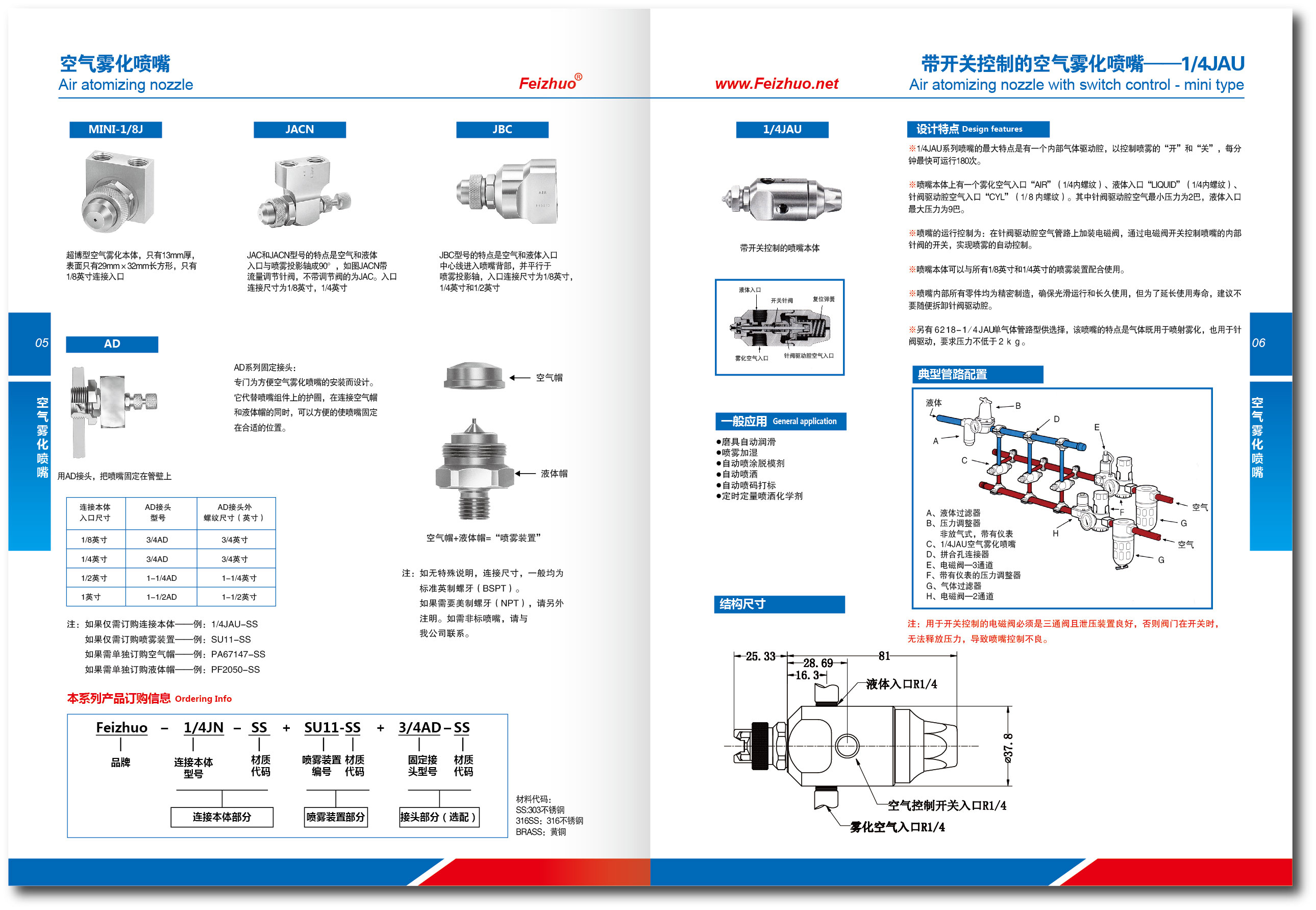 空气和液体入口中心线进入喷嘴背部,并平行于喷雾投影轴,入口连接尺寸为1/8英寸,1/4英寸,1/2英寸!